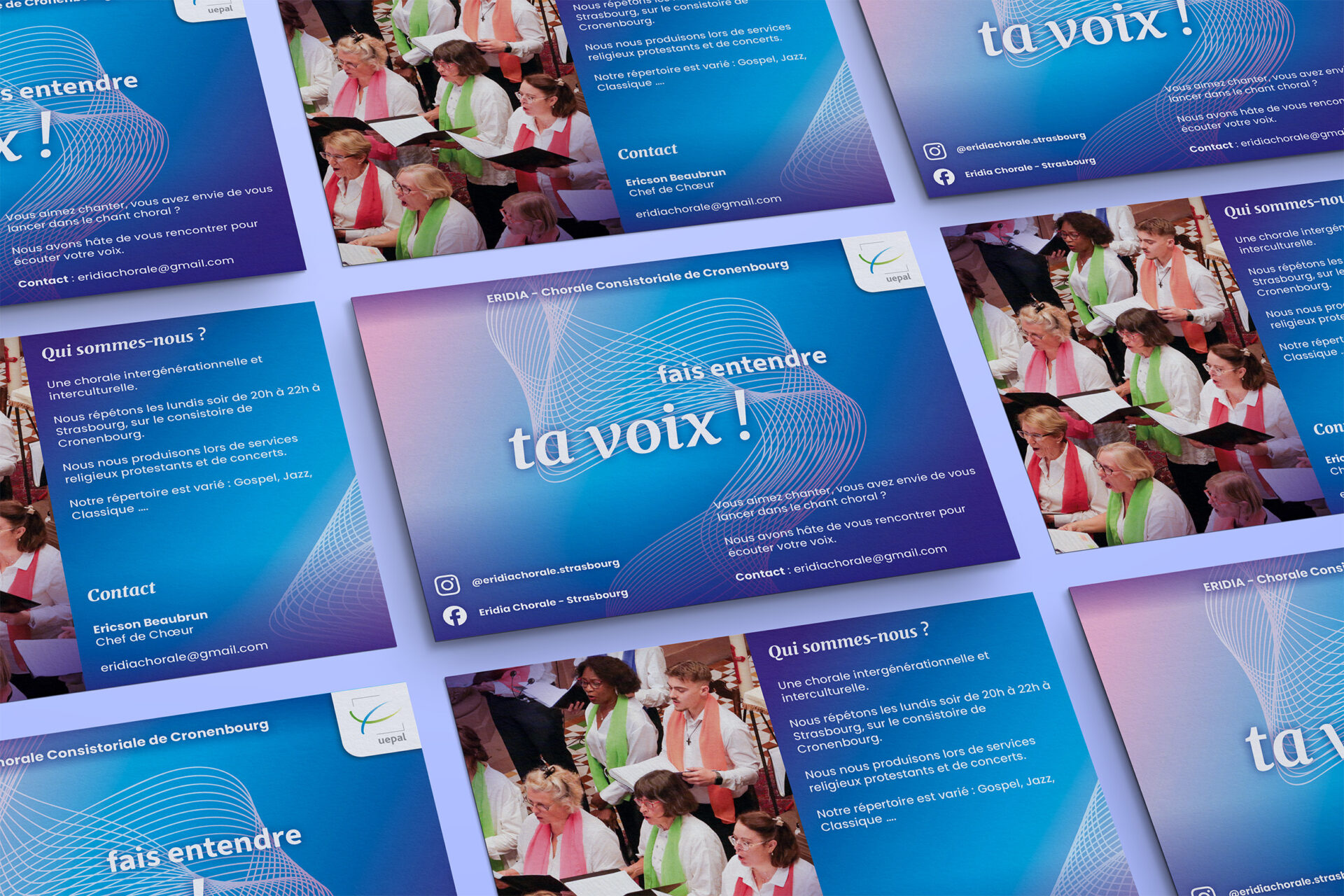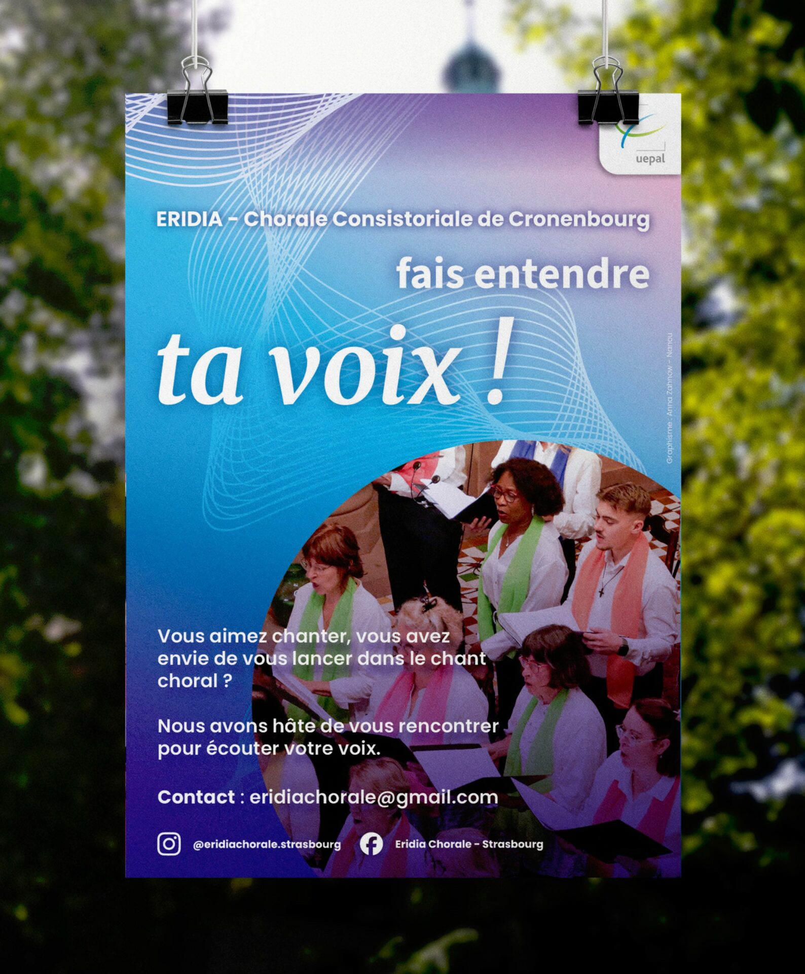 Dans le cadre de la campagne de recrutement de la chorale consistoriale de Cronenbourg, ERIDIA, on m’a fait appel pour créer un flyer qui permettra aux personne intéressées de se renseigner.